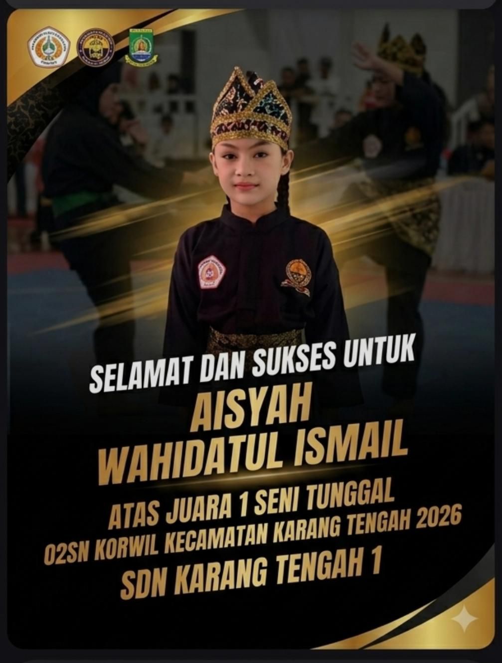 Kota Tangerang — Prestasi membanggakan kembali ditorehkan oleh dunia pendidikan di Kota Tangerang. Siswi berbakat, Aisyah Wahidatul Ismail, berhasil meraih Juara 1 cabang Seni Tunggal dalam ajang Olimpiade Olahraga Siswa Nasional (O2SN) Korwil Kecamatan Karang Tengah Tahun 2026.