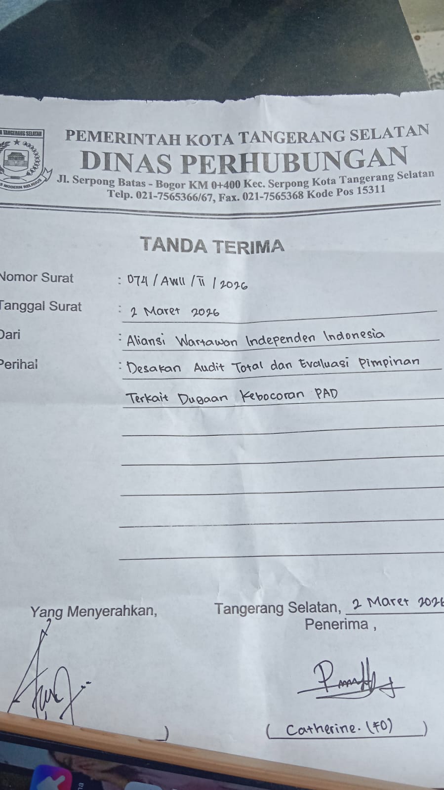 Tangerang Selatan, 2 Maret 2026 – Aliansi Wartawan Independen Indonesia (AWII) resmi mengguncang Dinas Perhubungan (Dishub) Kota Tangerang Selatan dengan melayangkan surat desakan audit total terkait dugaan kebocoran Pendapatan Asli Daerah (PAD).