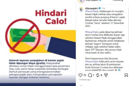 JAKARTA, Ditjen Pajak (DJP) mengimbau wajib pajak untuk tidak menggunakan jasa perantara atau calo dalam mengurus aktivasi akun coretax dan pembuatan kode otorisasi/sertifikat elektronik (KO/SE) DJP k...