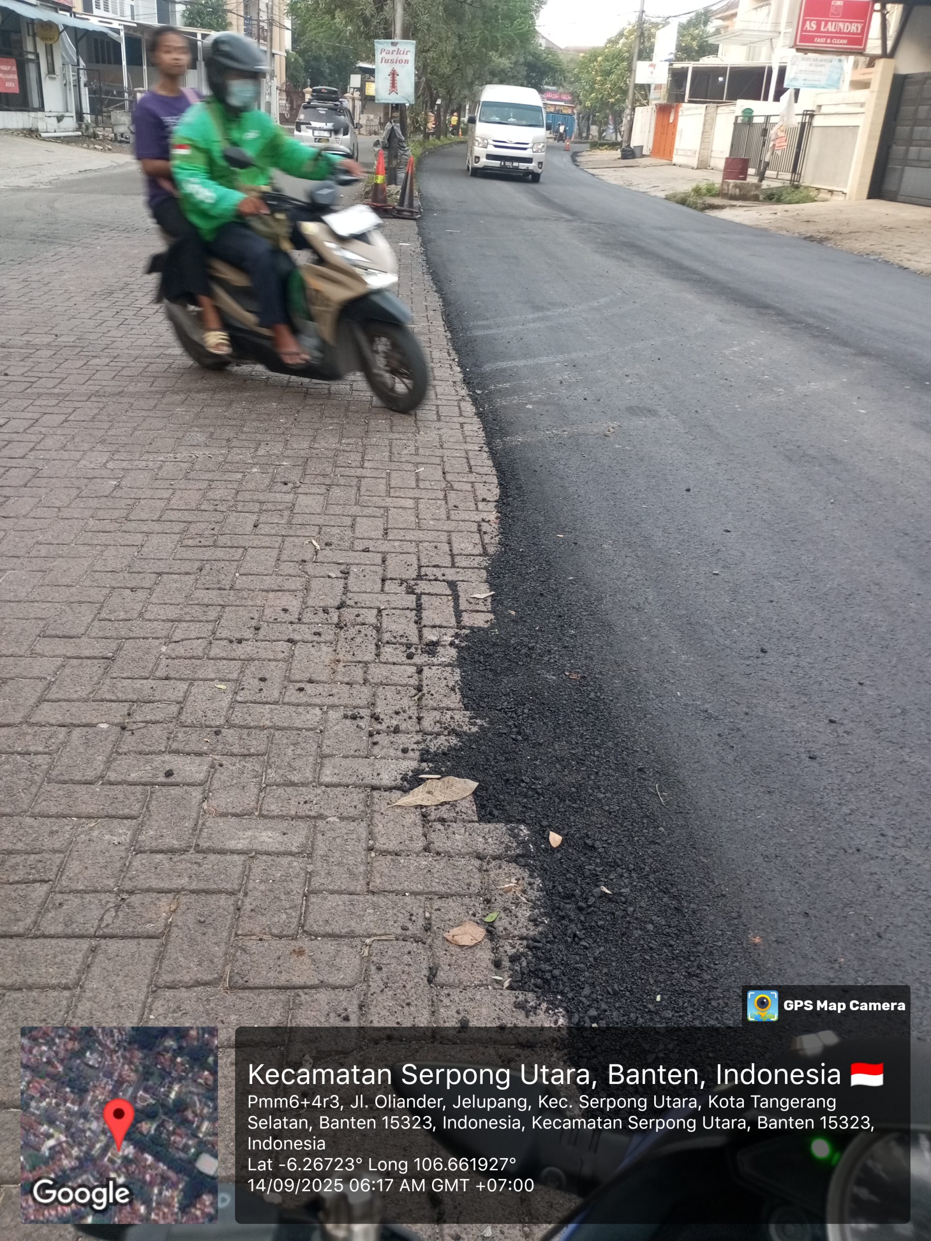 Dari pantauan lapangan pada 14 September 2025, terlihat kondisi pengerjaan jalan di Jalan Oliander, Jelupang, masih jauh dari rapi. Tumpukan material dibiarkan berserakan, sementara sebagian badan jalan sudah diaspal tanpa perataan sempurna. Area sambungan antara aspal baru dan paving lama pun tidak presisi, sehingga berpotensi membahayakan pengendara.