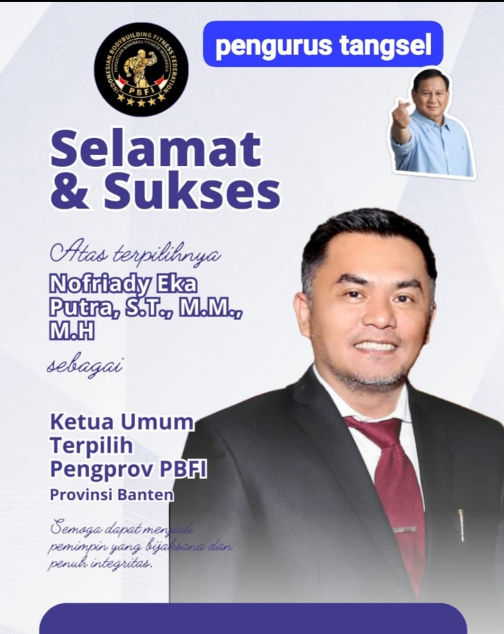 BANTEN – Nofriady Eka Saputra, ST., MM., MH. resmi terpilih sebagai Ketua Persatuan Binaraga dan Fitness Indonesia (PBFI) Provinsi Banten secara aklamasi setelah memperoleh dukungan mayoritas Pengurus Cabang (Pengcab) PBFI kabupaten/kota se-Provinsi Banten.